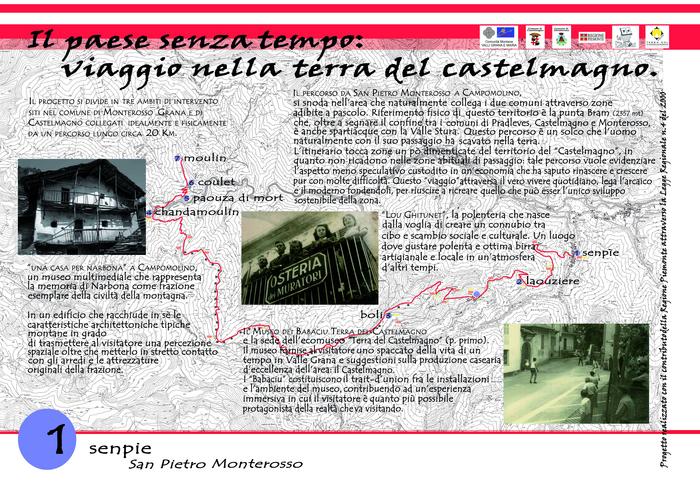 L’itinerario si snoda da San Pietro Monterosso a Campomolino toccando zone un po’ dimenticate del territorio del “Castelmagno”, in quanto non ricadono nelle zone abituali di passaggio: questo “viaggio” attraversa il vero vivere quotidiano, lega l’arcaico e il moderno fondendoli, per riuscire a ricreare quello che può essere l’unico sviluppo sostenibile della zona.