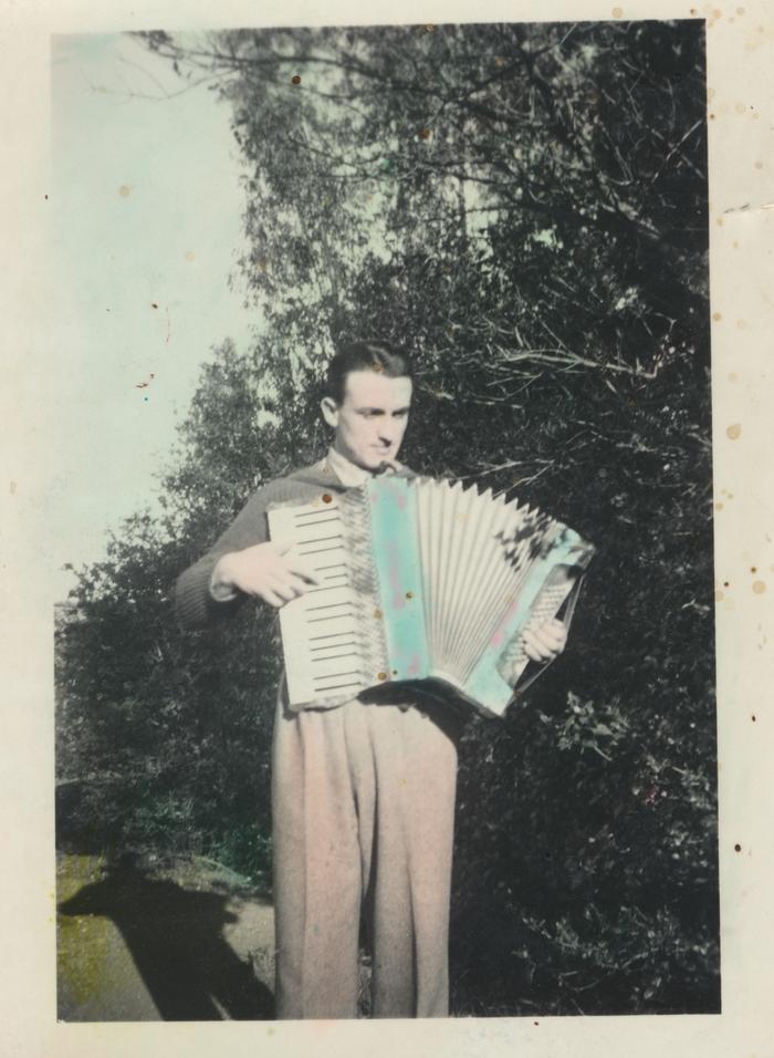 Immagine che ritrae un uomo mentre suona la fisarmonica all’aperto. L’immagine è stata colorata in un secondo momento