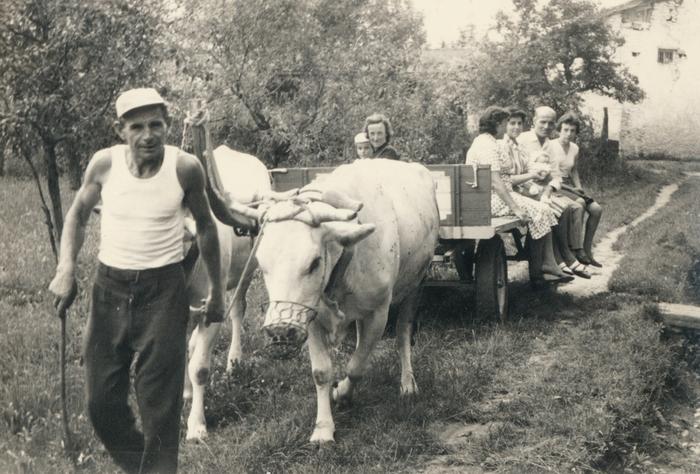 Immagine che ritrae un uomo che giuda un carretto trainato da buoi e carico di persone