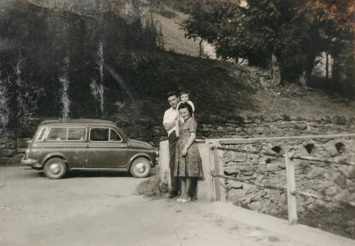 Immagine che ritrae una donna, un uomo e un bambino su una strada di montagna accanto a un’auto