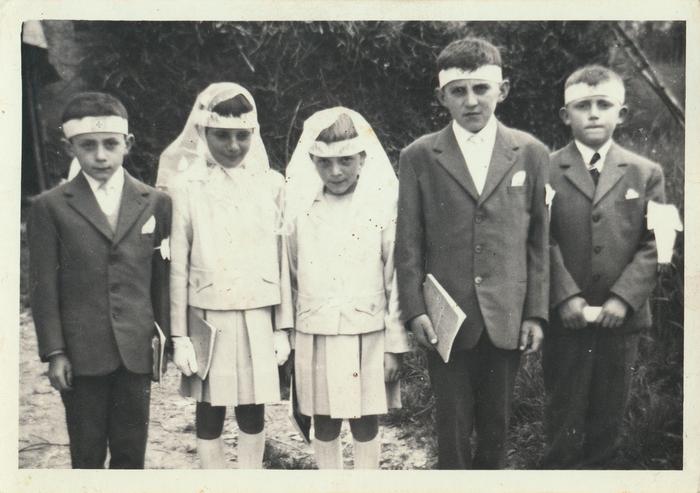 Immagine che ritrae tre bambini e due bambine vestiti da prima comunione in esterno